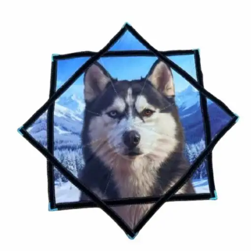דאפו האסקי הסיבירי הוא בד מסתובב בצורת מצולע 8 צלעות, עם הדפס ריאליסטי של כלב אסקי סיבירי על רקע נוף הררי מושלג.