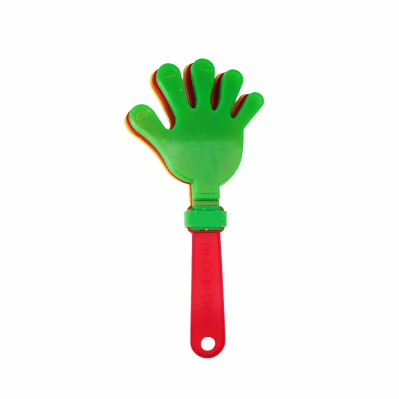 רעשן כפיים עשוי פלסטיק בצורת שתי כפות ידיים שמתקפלות זו על זו, עם ידית נוחה לאחיזה באורך 19 ס"מ.